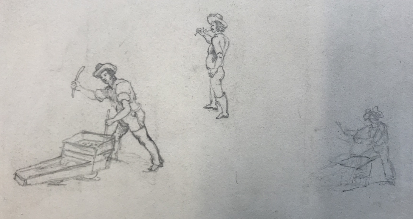 The reverse has Angas's staffage for the lithograph "Forest Creek, Mount Alexander, from Adelaide Hill", namely: the digger cradling (rough and final versions) and the digger smoking.