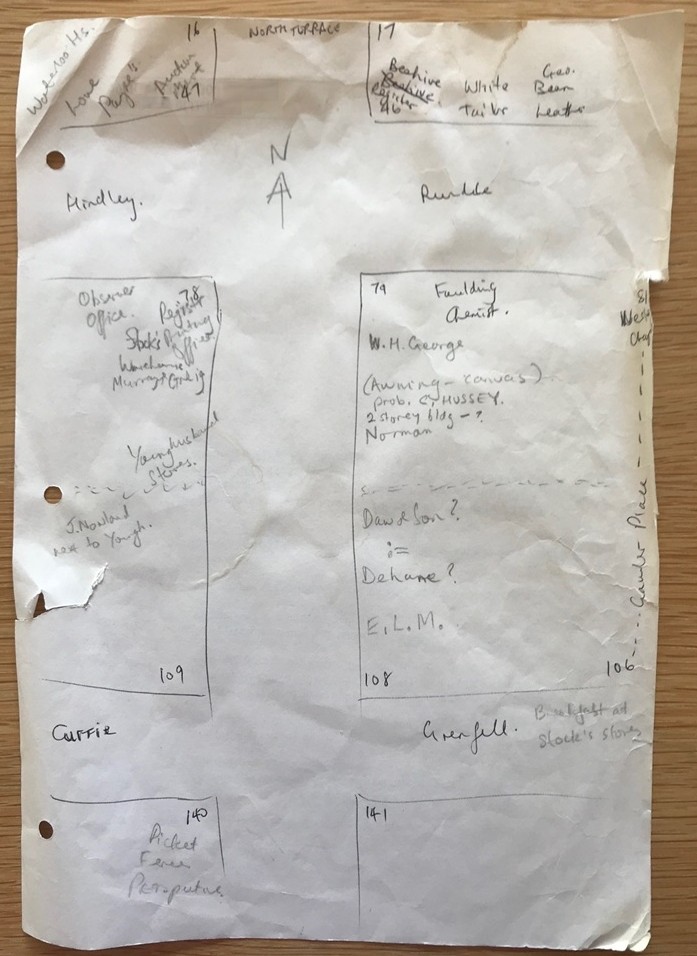 AltText: Tattered A4 sheet with pen and pencil annotations of buildings showing King William Street and intersections with Hindley/Rundle and Currie/Grenfell Streets. Also with Adelaide acre numbers.