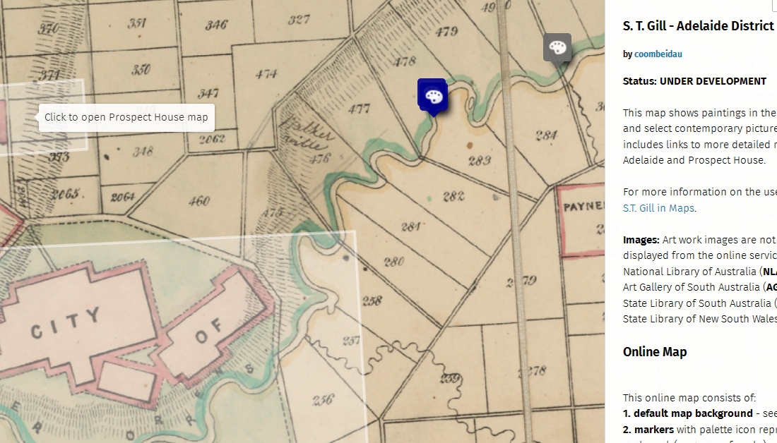 These articles take us to 1840s colonial South Australia and the world of artist S.T. Gill. They are components of a place and time machine. Much of Gill's work was rooted in time and place – his pictures of streets, buildings and natural scenery. So maps are prominent here, allowing us to visualise the art in context.