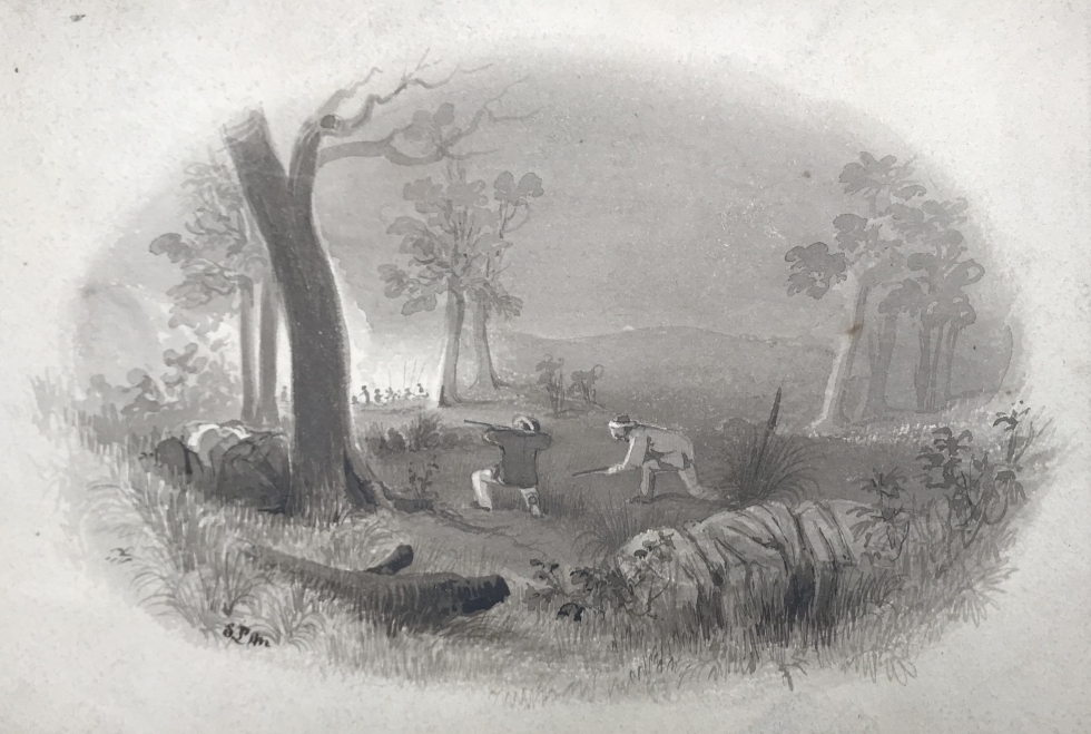 The kneeling gunman is similar to Aborigines and white men hunting kangaroos (NLA NK1196) | George French Angas in London and S.T. Gill