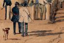 I tackled the painting that had the most clues: Hindley Street, Adelaide, looking west from King William Street (1845). This watercolour is included in the exhibition Australian Sketchbook: Colonial Life and the Art of S.T. Gill, at the National Library of Australia (NLA), Canberra, 29 June - 16 October 2016. It is also viewable online via the Art Gallery of South Australia (unfortunately however at insufficient resolution for study).