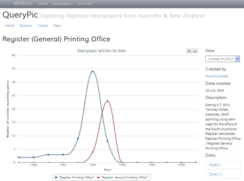 Crossing to the other side of the road in the painting, the Register Printing Office advertised stationery for sale from 1 May 1844 to April 1845. (The Register General Printing Office was elsewhere on the corner of King William Street and Rundle Street.) Noting a shift in nomenclature around 1844, I tested this observation using @wragge Tim Sherratt’s QueryPic.