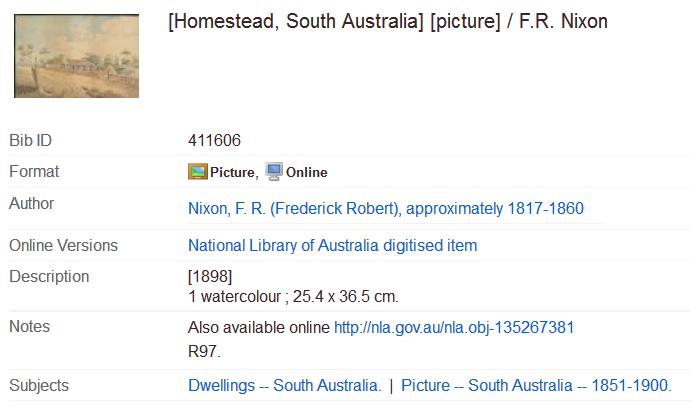 When I saw this painting I immediately knew something was wrong. The National Library of Australia (NLA) catalogue (viewed 7 May 2018) titles this work “[Homestead, South Australia]” – it looks like a homestead – and gives the date as “July 1898”. The watercolour is signed “F.R. Nixon” – in the middle of the sweeping dirt track – where it is also dated.