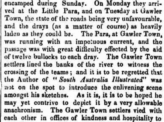 So much for the breakfast. In King William-street the well-loaded drays were ranged in order, one carrying a large boat… The day was fine, but the roads wet and muddy. Many a coat was well spangled, and many a face but little better for its morning wash. Halting—it was amusing to see folks with their faces half-daubed already, daubing them entirely in their vain attempts to remove the mud, and asking their neighbours—"Is it cleaner now?"