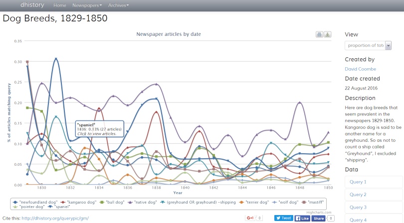 Using @wragge Tim Sherratt’s QueryPic, here is a chart of some dog breeds prevalent in the newspapers 1829-1850. Kangaroo dog is said to be another name for a greyhound. So as not to count a ship called Greyhound, I excluded “shipping” articles for it! I had hoped it may be an approximation to the popularity of dog breeds (or their names.) You may do better. (You will see the graph more clearly, with supporting data, if you follow the link in my Trove list. You can even make your own graph in QueryPic.)