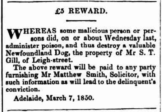 Wanton Cruelty.—Some outrageous brute or other has poisoned the fine Newfoundland dog, so long the property of Mr Samuel Gill, the artist. Mr Gill offers a reward of £5 for the discovery of the perpetrator, and we sincerely hope he may be brought to justice.